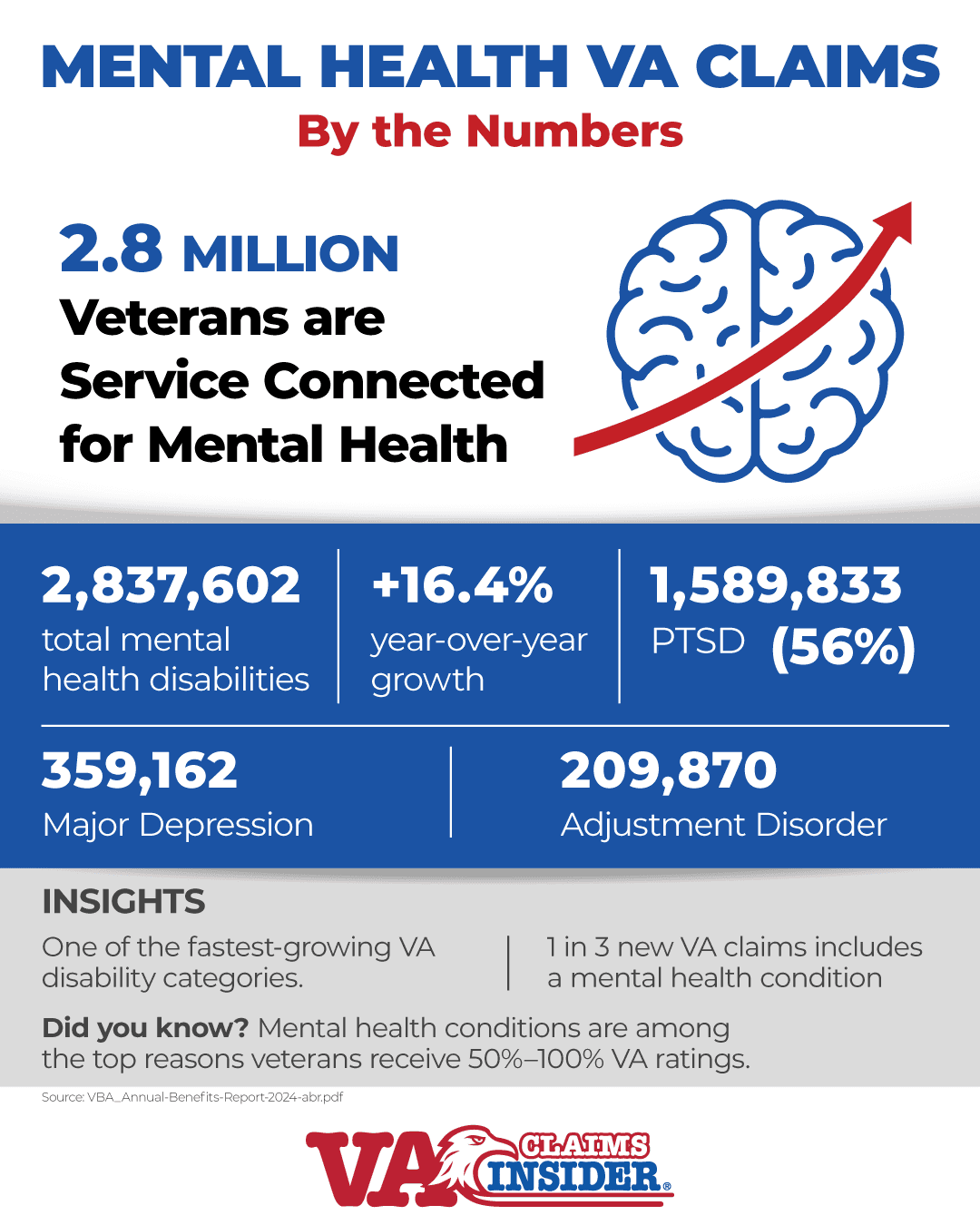 - Veterans mental health claims jumped 77% since 2020, and 163,644 new mental health ratings were granted in FY 2024 alone, showing that the stigma around mental health is lifting.